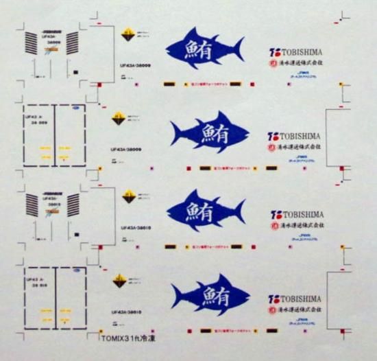 Nゲージサイズの31ftコンテナ(UF43A清水運送 鮪)を再現できるデカールです。大きさは、TOMIX 31ft冷凍にあわせています。2個分収録してあり、番号はUF43A-38009,010になります。デカールはクリヤーデカールでお届けします。