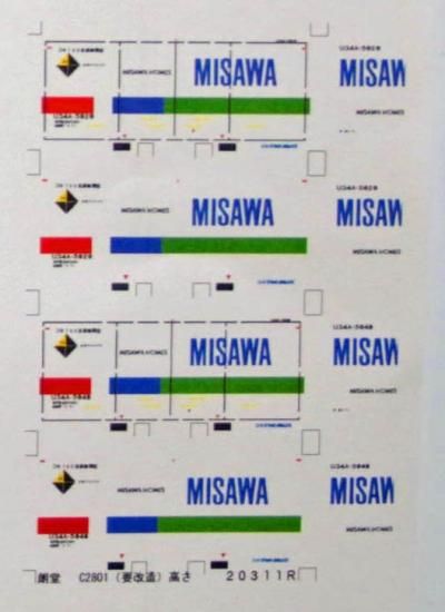 Nゲージサイズの20ftコンテナ(MISAWA)を再現できるデカールです。大きさは朗堂C2801(要改造高さ)にあわせています。2個分収録してあります。番号はU34A-5020,5048です。デカールはクリヤーデカールでお届けします。