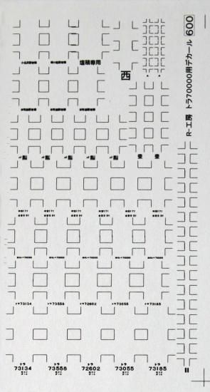 Nゲージサイズのトラ70000(平板仕様)の白文字が印刷してあるデカールです。番号の他に、形式、換算、所属、連結注意等、文字は全て収録してあります。5両分収録してあります。