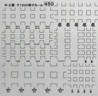 Nゲージサイズのテ1200の白文字が印刷してあるデカールです。番号の他に、形式、換算、所属、連結注意等、文字は全て収録してあります。5両分収録してあります。