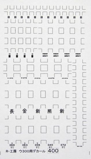 Nゲージサイズのウ300の白文字が印刷してあるデカールです。番号の他に、形式、換算、所属、連結注意等、文字は全て収録してあります。5両分収録してあります。