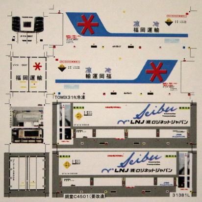 Nゲージサイズの31ftコンテナ(UF41ALNJロジネットジャパン・福岡運輸)を再現できるデカールです。大きさは朗堂C4501、TOMIX冷凍にあわせています。2個分収録してあり、番号はUF41Aー38008、38007になります。