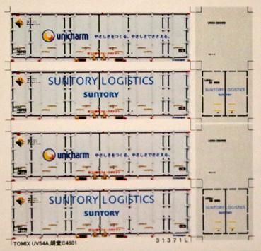 Nゲージサイズの31ftコンテナ(サントリー、ユニチャーム)を再現できるデカールです。大きさは朗堂CB-3101にあわせています。写真ではTOMIX、朗堂C4601とありますが、朗堂から適合品出ましたので、CB3101です。2個分収録してあり、番号はU50A-38007,38008になります。写真2は完成見本です。