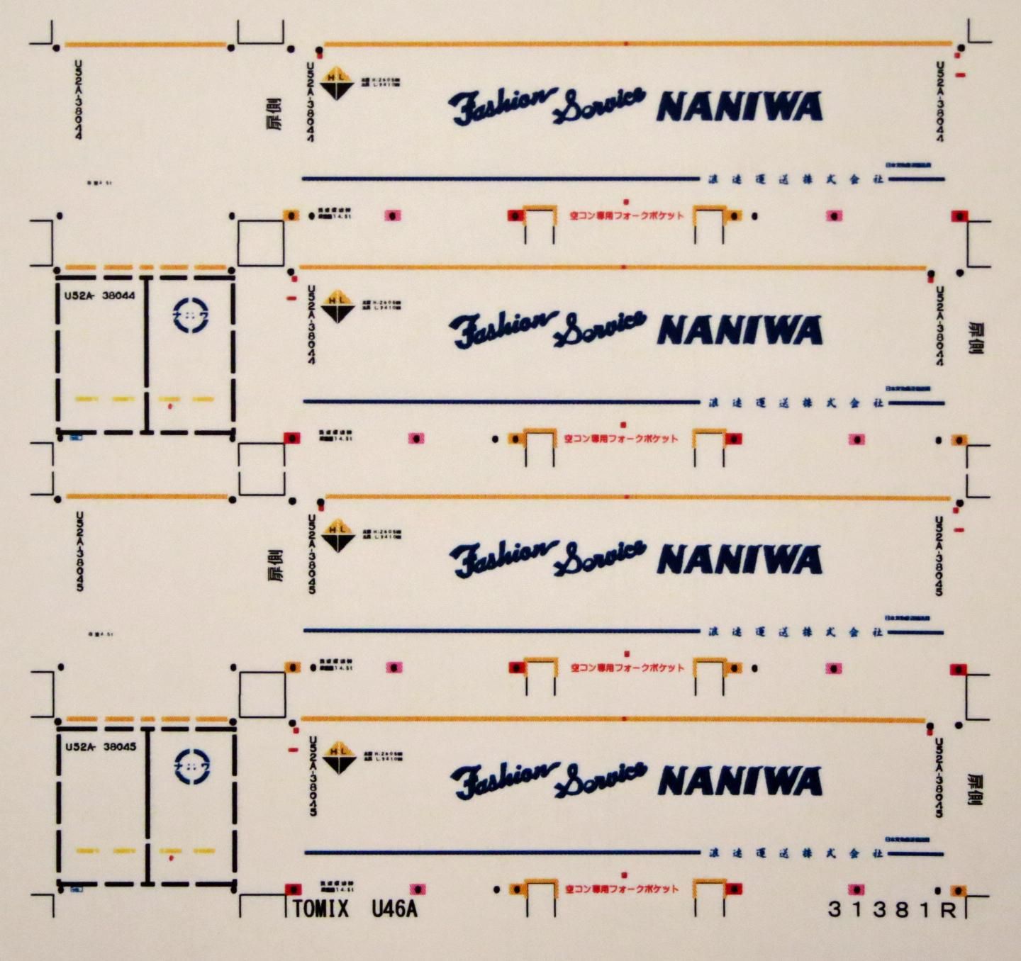 Nゲージサイズの31ftコンテナ(NANIAW)を再現できるデカールです。大きさは朗堂CA-3101にあわせています。写真1ではTOMIXU46Aですが、朗堂が出ましたので、朗堂に合わせています。2個分収録してあります。デカールはクリヤーデカールでお届けします。写真2は制作見本です。
