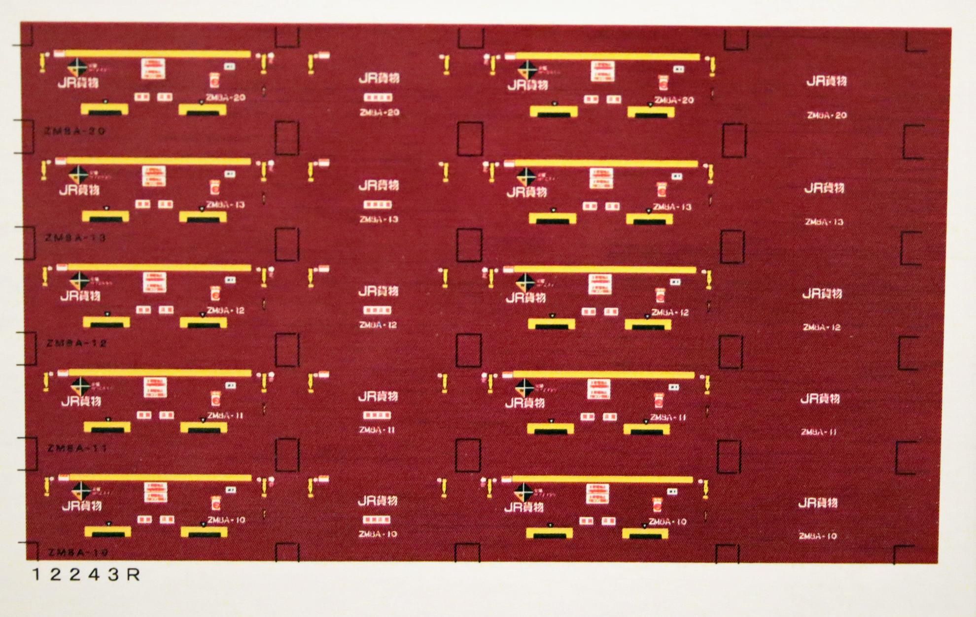 Nゲージサイズの12ftコンテナ(ZM8A)を再現できるデカールです。5個分収録してあり、番号はZM8A-10,11,12,13,20になります。尚写真では地色のあずき色が印刷されていますが、クリヤーデカールでお届けします。地色付き希望の方はお申し付けください。