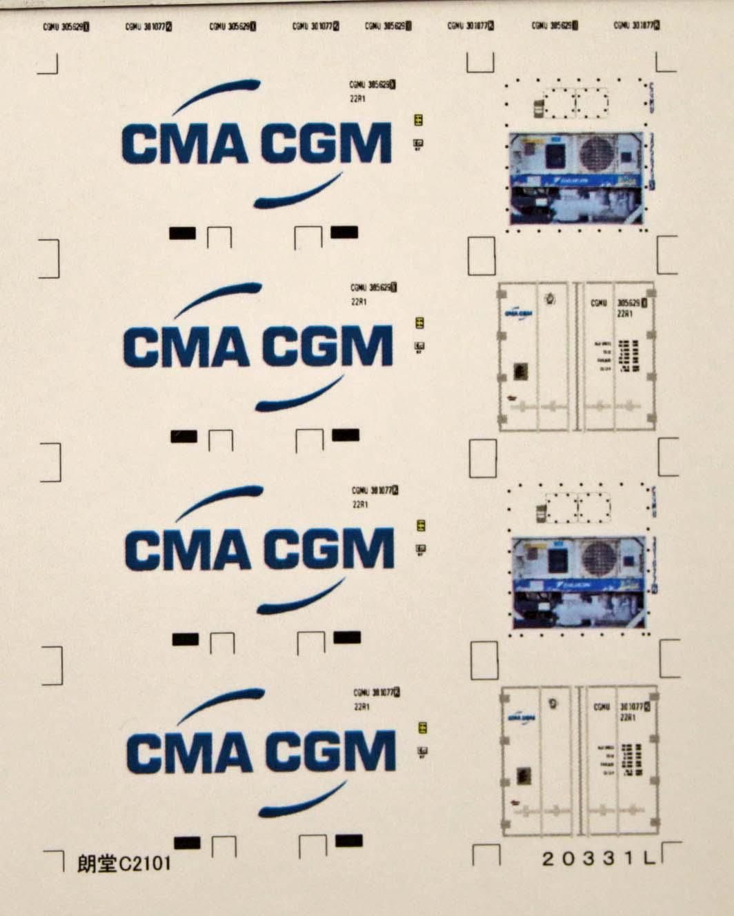 Nゲージサイズの20ftコンテナ(CMA CGM)22Rを再現できるデカールです。大きさは朗堂C2101に合わせてあります。クリヤーデカールでお届けします。