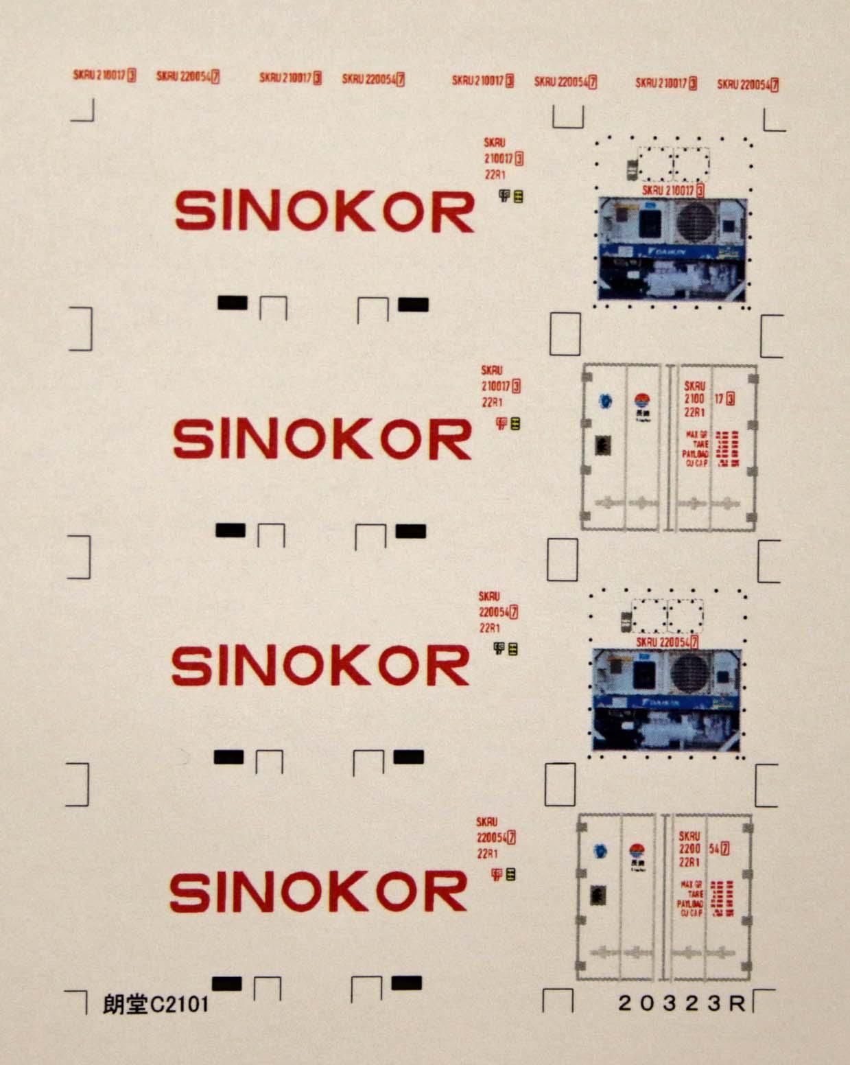 Nゲージサイズの20ftコンテナ(SINOKOR)22Rを再現できるデカールです。大きさは朗堂C2101に合わせてあります。クリヤーデカールでお届けします。