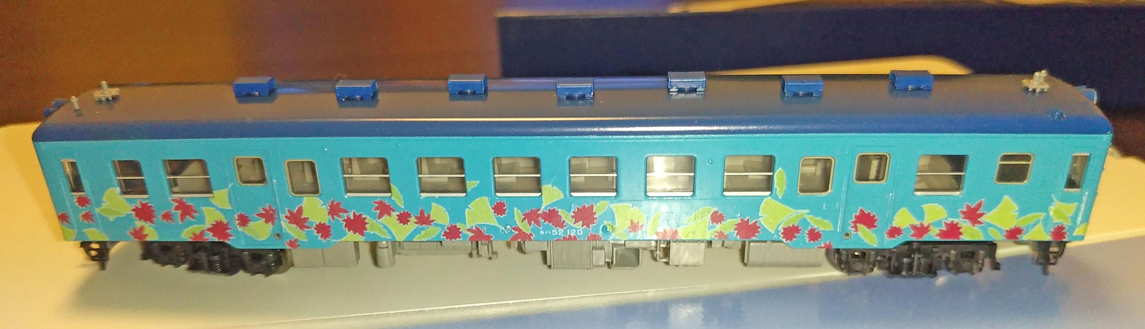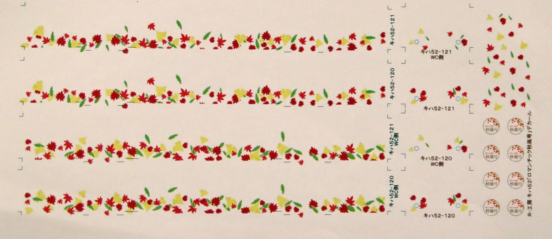 キハ52「ロマンチック秋風」を再現できる、Nゲージサイズのデカールです。クリヤーデカールに印刷してあります。塗装後貼り付けて下さい。寸法はTOMIX製で採寸していますが、KATOもほとんど同じです。尚地色付きもございます。希望の方は備考欄にてお申し付け下さい。写真2は完成見本です。