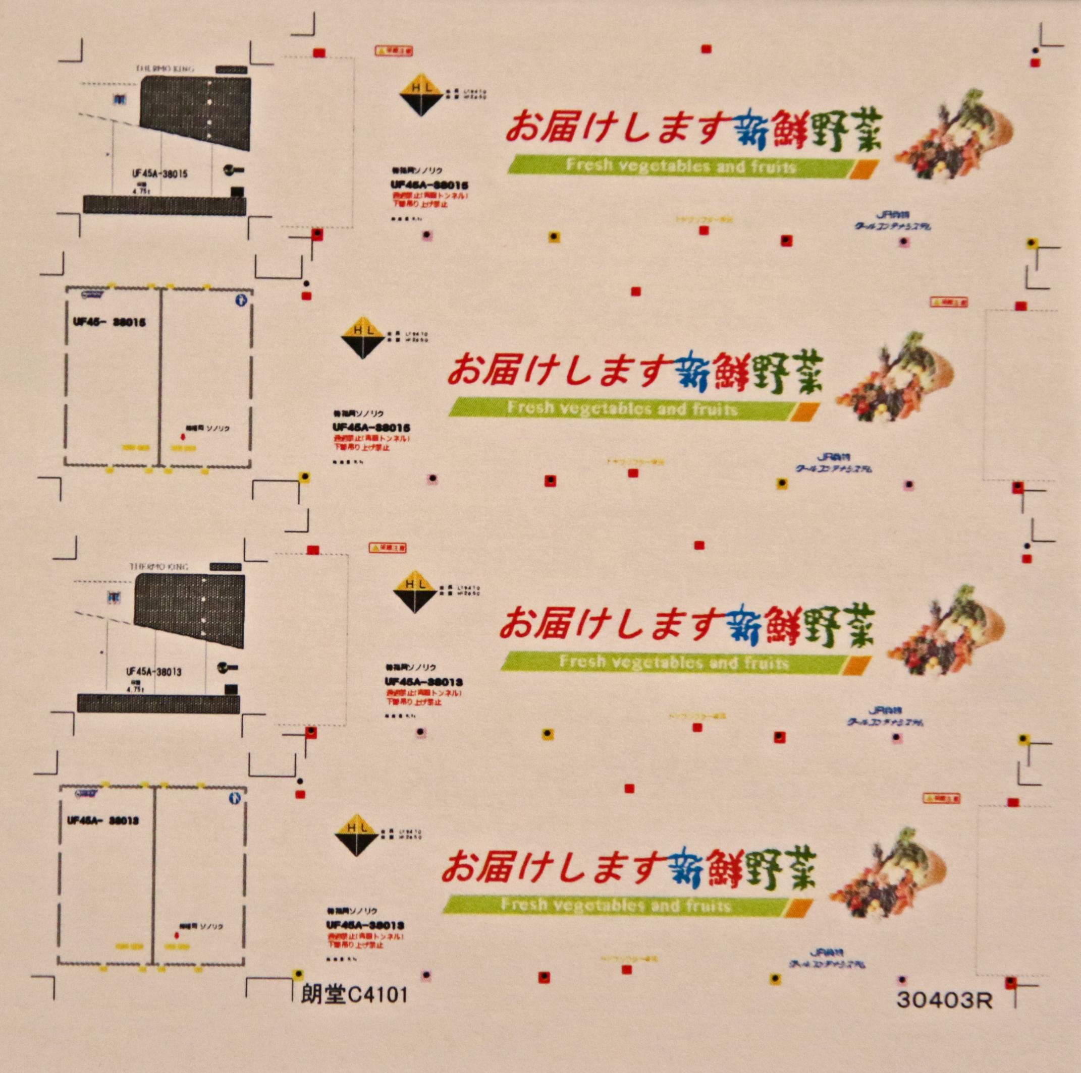 Nゲージサイズの31ftコンテナ(UF45Aのお届けします新鮮野菜)を再現できるデカールです。大きさは朗堂C-4101にあわせています。2個分収録してあり、番号はUF45A-38013,38015になります。デカールはクリヤーデカールでお届けします。