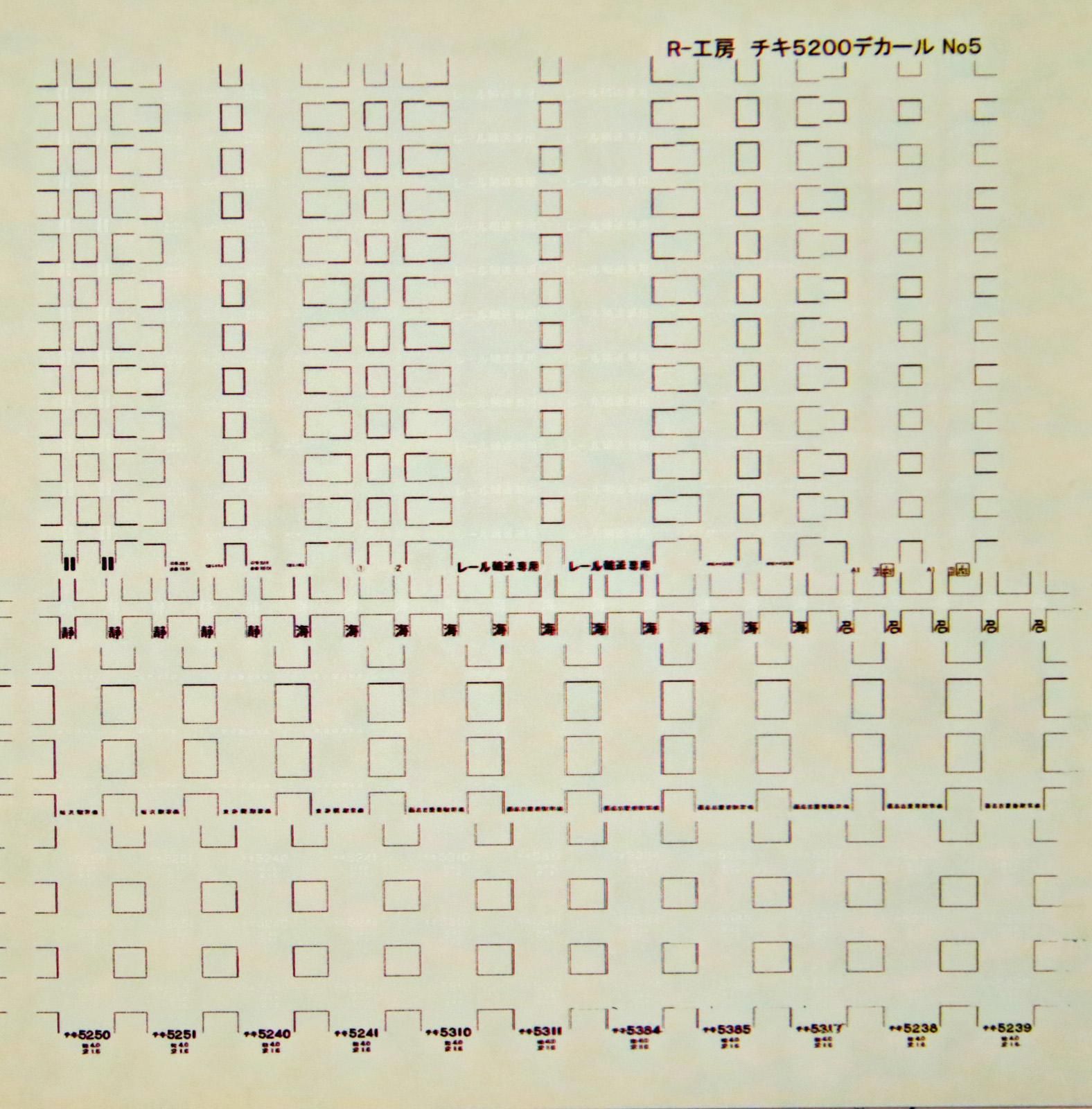 Nゲージサイズのチキ5200の番号、他表記を全て収録しています。地域ごとにNoを分けています。10両分収録しています。No1は岩見沢駅常備、No2は越中島駅常備、No3は品川駅常備、No4は高萩駅常備、釜石駅常備、秋田操駅常備、新津駅常備、No5は東静岡駅常備、稲沢駅常備、西名古屋港駅常備、No6は東静岡駅常備、名古屋資材センター常備、名古屋資材倉庫常備、No7は松任駅常備、富山駅常備、浪速駅常備、福知山駅常備、岡山タ駅常備、No8は東福山駅常備、東広島駅常備、小郡駅常備、新山口駅常備、No9は鳥栖駅常備、大分駅常備、鹿児島駅常備です。写真はNo5です。