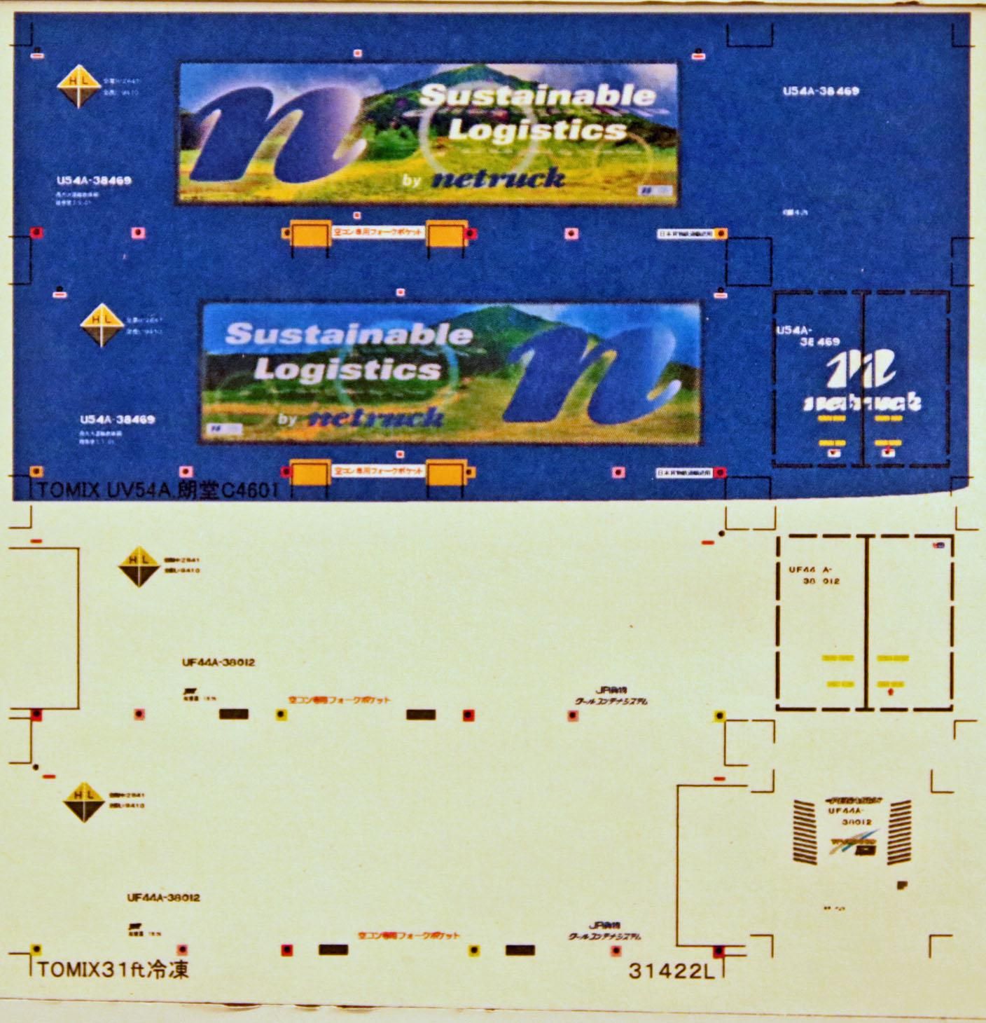 Nゲージサイズの30ftコンテナU54A(netruck新型)UF44A無地を再現できるデカールです。大きさはTOMIX UV54A,朗堂C4601、TOMIX冷凍機コンテナに適合するように、制作しています。2個分印刷しています。写真ではコンテナの紺色の地色が印刷されていますが、クリヤーでお届けします。写真のような色付き希望の方は、購入時に備考欄でお申し付けください。尚この商品は、地色付きはインクジェットに変更しましたので、切り出し後にクリヤーでのコーティングが必要になります。