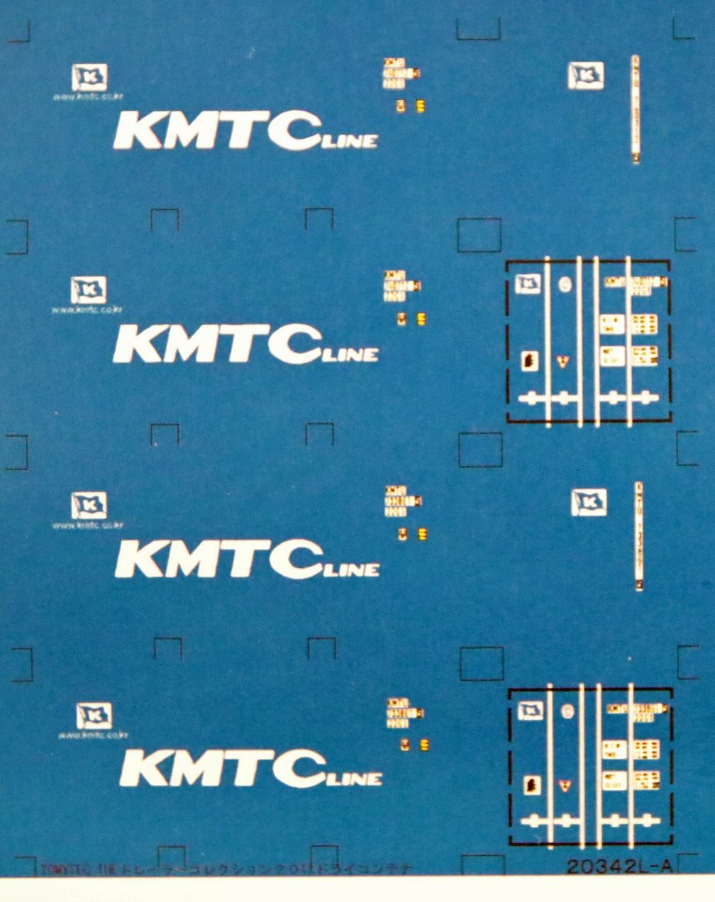 Nゲージサイズの20ftコンテナKMTCを再現できるデカールです。大きさは朗堂C2101に適合するように、制作しています。画像ではコンテナの地色の青色が印刷されていますが、お届けするデカールは、透明のデカールに印刷したものでお届けします。ですので、地色は印刷されていません。もちろん白色も印刷されています。2個分印刷しています。番号違いで3種類ございます。