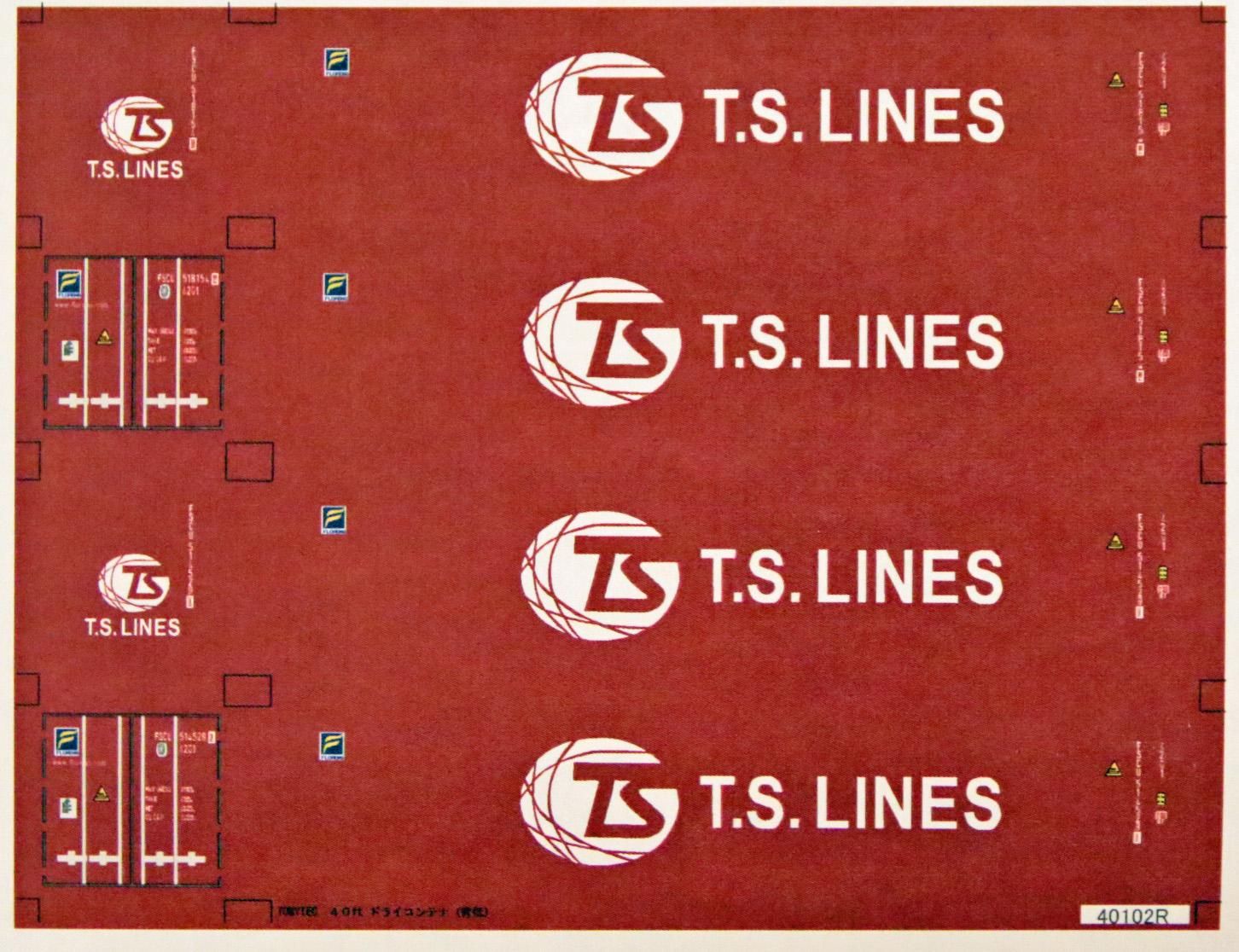 Nゲージサイズの40ftコンテナTSLINES Frorens背低を再現できるデカールです。大きさはTOMIX40ftドライコンテナ背低に合わせています。写真では地色付きですが、地色無しのクリヤーデカールでお届けします。地色付き希望の方は、備考欄にてお申し付け下さい。