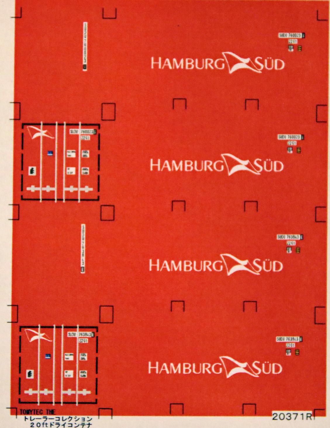 Nゲージサイズの20ftコンテナ(HAMBURGSUD)新22Gを再現できるデカールです。大きさはTOMYトラコレのドライコンテナに合わせてあります。写真ではコンテナの地色が印刷してありますが、デカールはクリヤーデカールでお届けします。尚写真のようなコンテナの地色を印刷したものもありますので、そちらを希望の場合はお申し付けください。