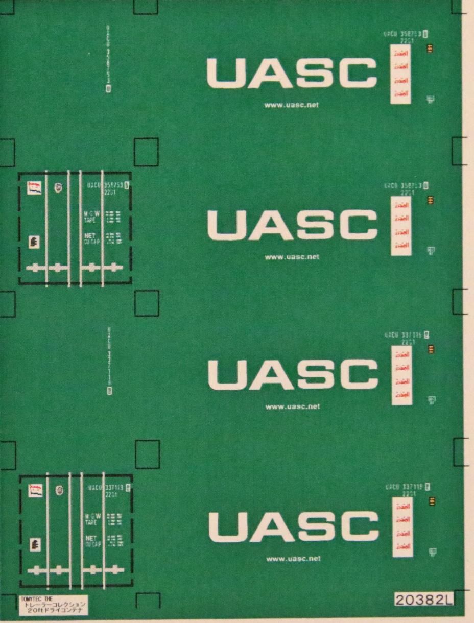 Nゲージサイズの20ftコンテナ(UASC)22Gを再現できるデカールです。大きさはTOMYトラコレのドライコンテナに合わせてあります。写真ではコンテナの地色が印刷してありますが、デカールはクリヤーデカールでお届けします。尚写真のようなコンテナの地色を印刷したものもありますので、そちらを希望の場合はお申し付けください。