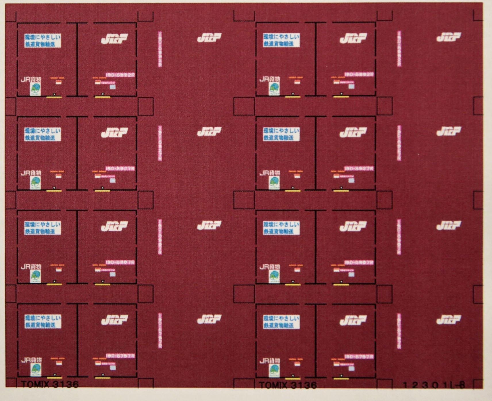 Nゲージサイズの12ftコンテナ19D「リニューアル」を再現できるデカールです。4個分収録してあり,番号は19D-6360R,8205R,8304R,8679Rか19D-8797R,8907R,8927R,8992Rのいずれかになります。写真では小豆色が印刷せれていますが、クリヤーデカールでお届けいたします。写真のような地色付きを希望の方は、備考欄で地色付きとお申し付けください。大きさはTOMIX3136「裏の刻印」に合わせています。番号違いで2種類あります。同時注文で複数注文の場合は番号違いで発送いたします。