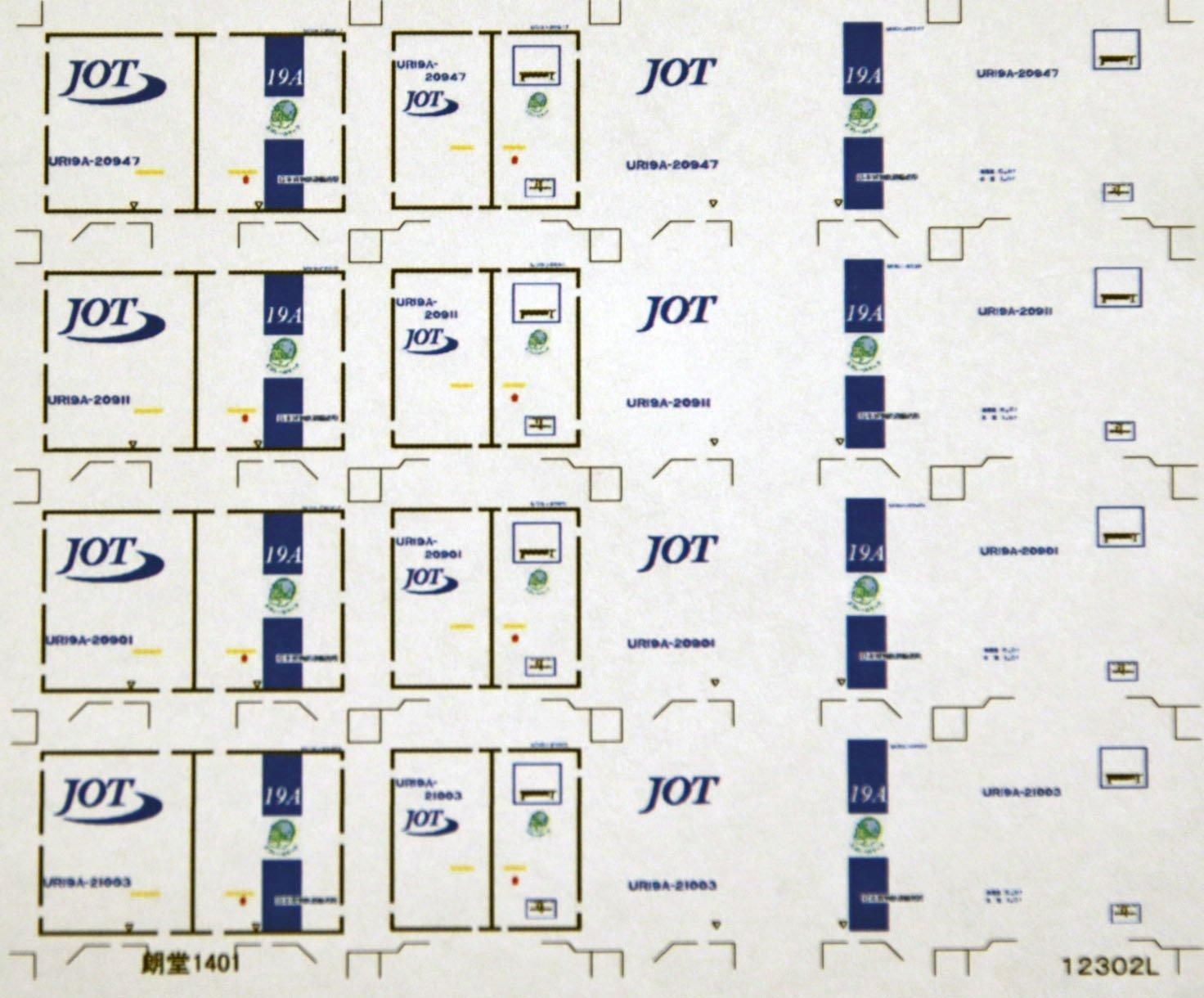 Nゲージサイズの12ftコンテナUR19A「ハローマーク無」を再現できるデカールです。4個分収録してあり,番号はUR19A-21003,20901,20911,20947になります。クリヤーデカールでお届けいたします。大きさは朗堂C1401に合わせています。