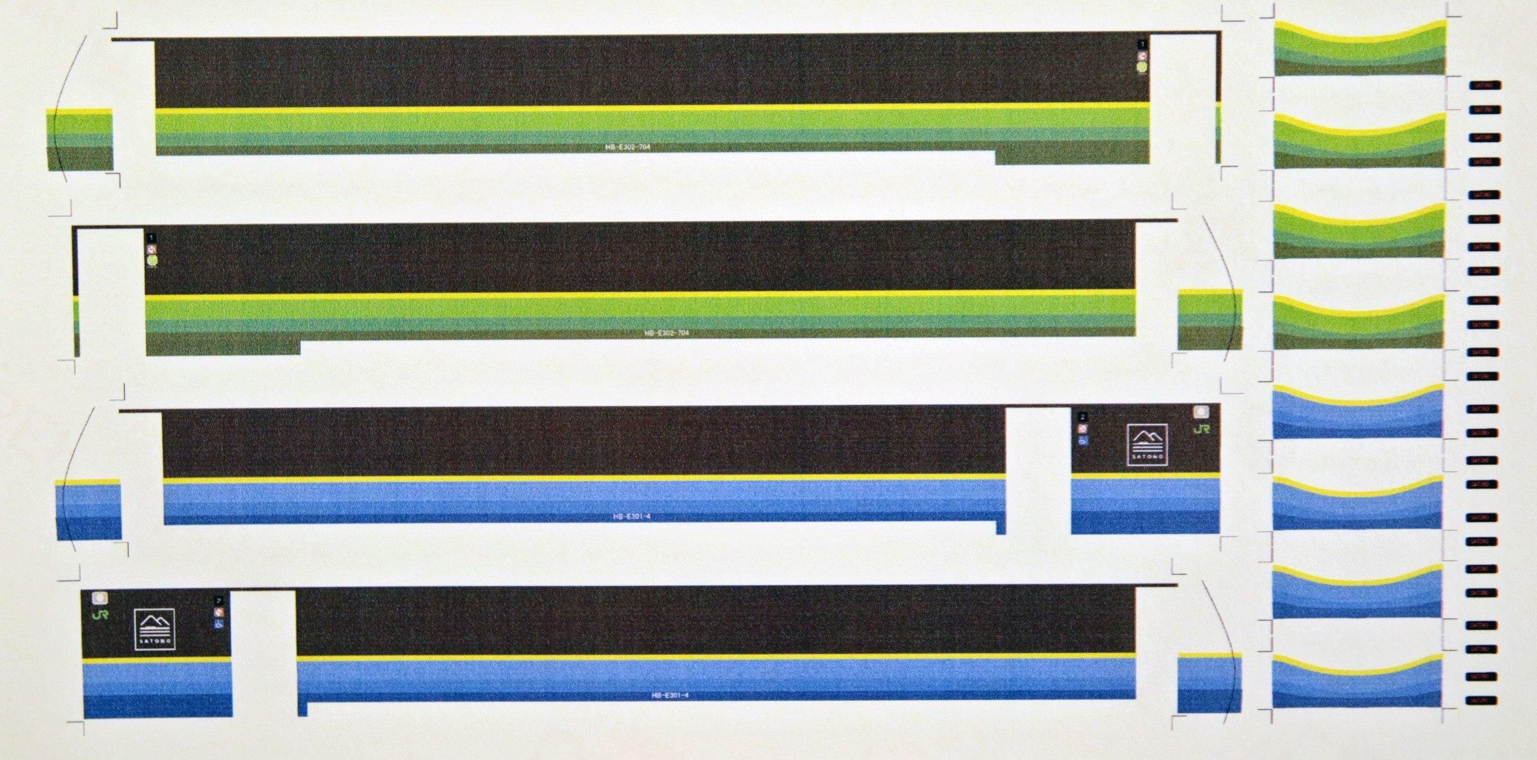 HB−E300「SATONO」を再現できるデカールです。クリヤーデカールに印刷してあります。水色、黄緑を塗装後に貼り付けてください。