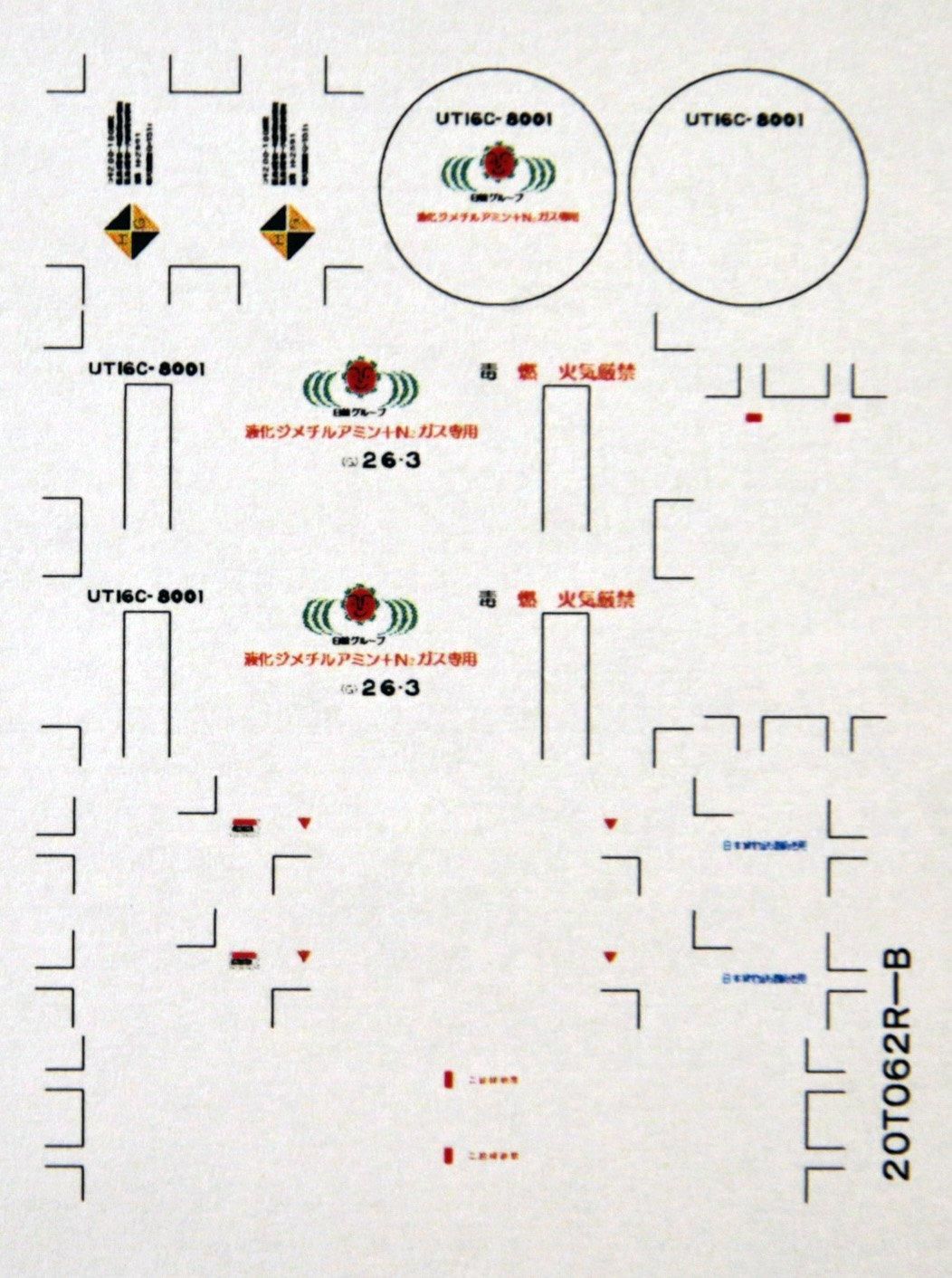 Nゲージサイズの20ftタンクコンテナUT16C-8000(液化ジメチルアミン専用)を再現できるデカールです。1個分収録してあります。番号違いが2種類ございます。複数注文の場合は番号違いで発送いたします。