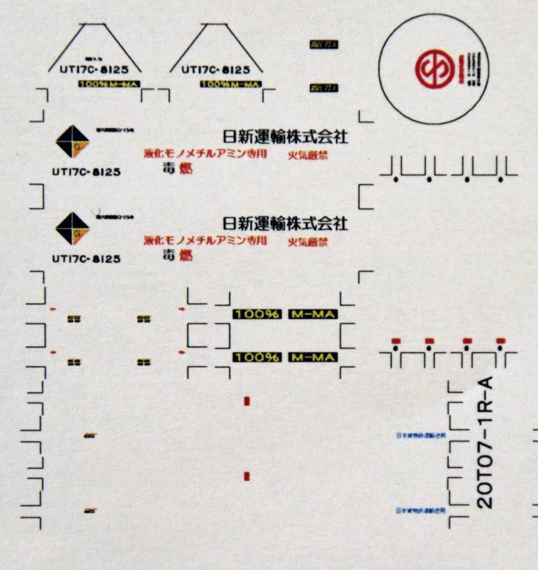 Nゲージサイズの20ftタンクコンテナUT17C-8100(液化モノメチルアミン専用)を再現できるデカールです。1個分収録してあります。番号違いが2種類ございます。複数注文の場合は番号違いで発送いたします。