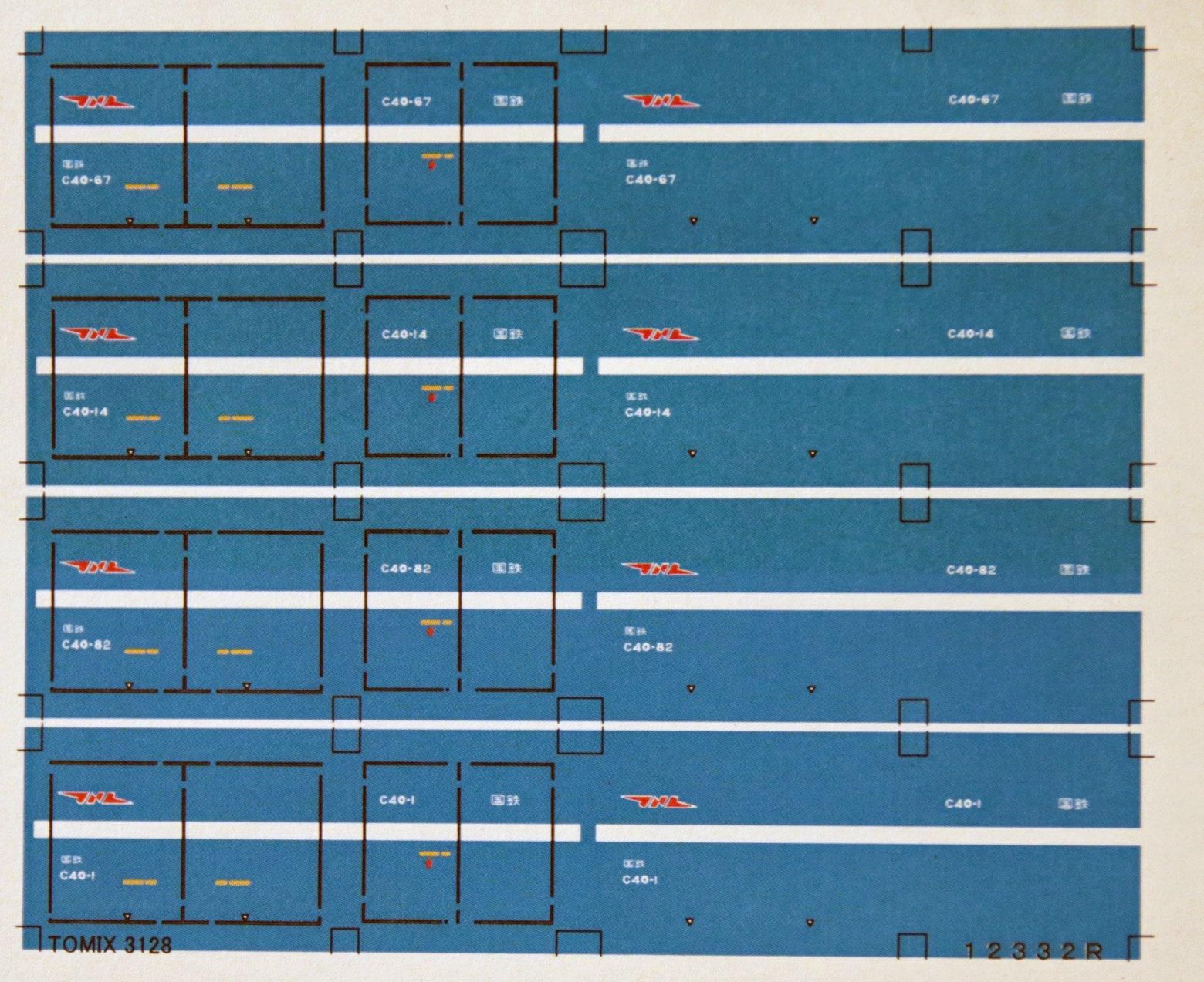 NゲージサイズのC40を再現できるデカールです。大きさはTOMIX(3128裏の刻印)にあわせています。4個分収録してあり、番号はC40-1,82,14,67になります。写真ではコンテナの地色の青色が印刷してありますが、デカールはクリヤーデカールでお届けします。尚写真のようなコンテナの地色を印刷したものもありますので、そちらを希望の場合はお申し付けください。