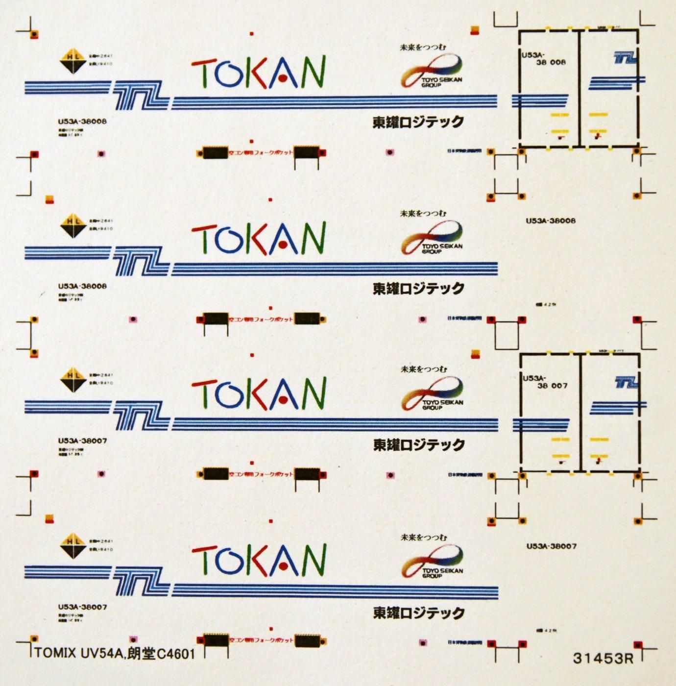 Nゲージサイズの31ftコンテナ「TOKAN」を再現できるデカールです。大きさはTOMIX,UV54A,朗堂C4601にあわせています。番号はU53A-38007,008になります。クリヤーでカールでお届けします。写真2枚目は屋根部分です。2個分収録してます。