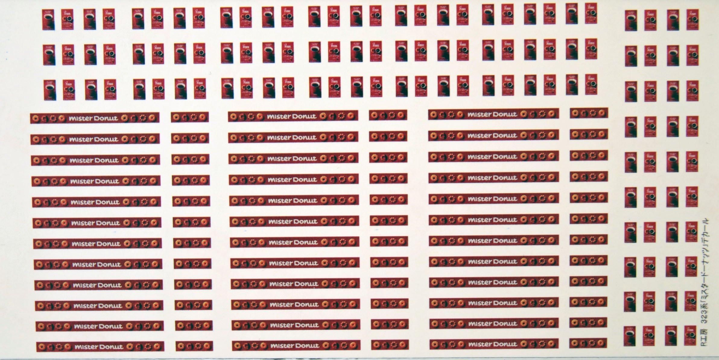 323系「ミスタードーナッツ」を再現できる、Nゲージサイズのデカールです。クリヤーデカールに印刷してあります。1編成分+α収録