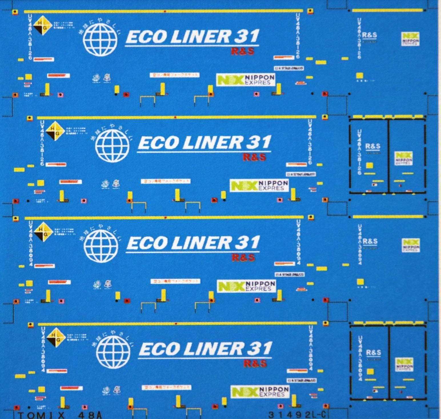 Nゲージサイズの31ftコンテナ「ECO LINER31 R&S"NEX"」UV48Aを再現できるデカールです。大きさはTOMIX-U48Aにあわせています。2個分収録してあり、番号違いで3種類あります。複数同時注文で、番号違いで発送いたします。写真ではコンテナの地色の水色が印刷してありますが、デカールはクリヤーデカールでお届けします。尚写真のようなコンテナの地色を印刷したものもありますので、そちらを希望の場合はお申し付けください。