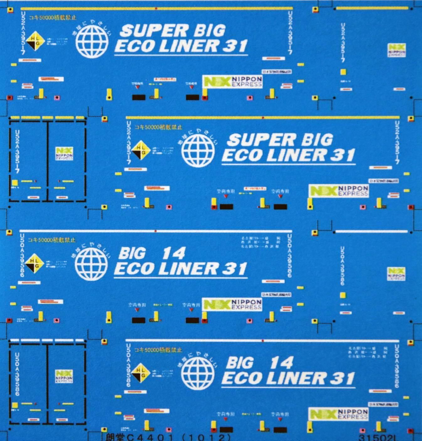 Nゲージサイズの31ftコンテナ「SUPER BIG ECO LINER、BIG14 ECO LINER31 "NEX"」U52A,U50Aを再現できるデカールです。大きさは朗堂C4401 にあわせています。番号はU52A-39517,U50A-39568になります。写真ではコンテナの地色の水色が印刷してありますが、デカールはクリヤーデカールでお届けします。尚写真のようなコンテナの地色を印刷したものもありますので、そちらを希望の場合はお申し付けください。