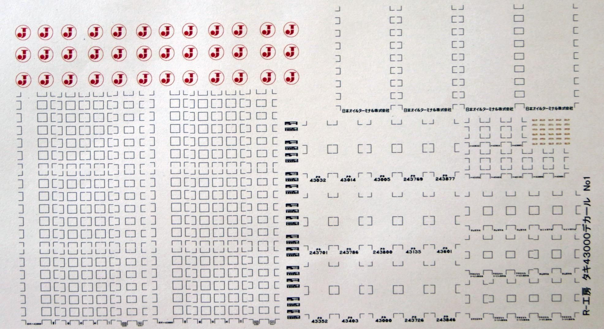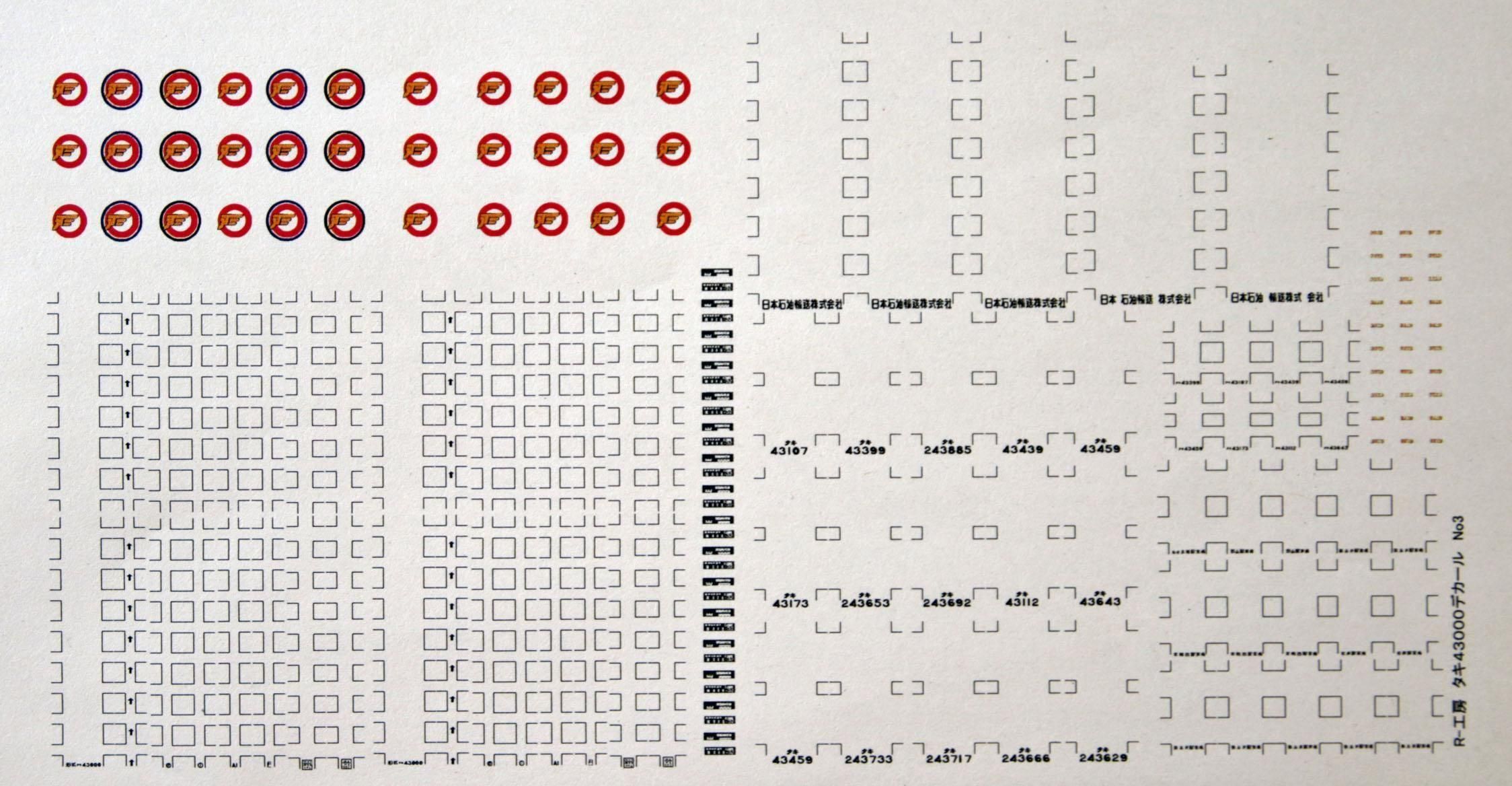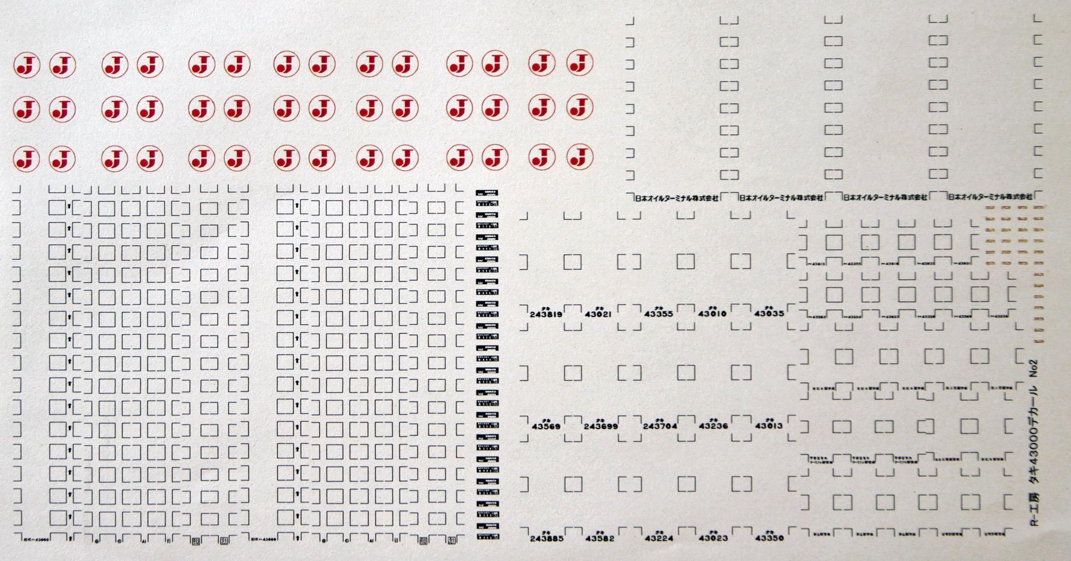 Nゲージサイズのタキ43000の社紋、社名、ナンバー、常備駅、形式43000、換算、台枠部分の番号が再現できる白文字のデカールです。15両分収録してあり、番号、所属は実物に合わせてあります。写真1〜4までありますが価格は写真1枚分(15両分)になります。購入時にNo※と指定して下さい。写真1(No1)は日本オイルターミナルで番号は43000番台8両243000番台7両です。写真2(No2)は日本オイルターミナルで番号は43000番台11両243000番台4両です。写真3(No3)は日本石油輸送で番号は43000番台8両243000番台7両です。写真4(No4)は日本石油輸送で番号は43000番台3両243000番台12両です。番号指定ない場合はNo1〜4までのどれかになります。