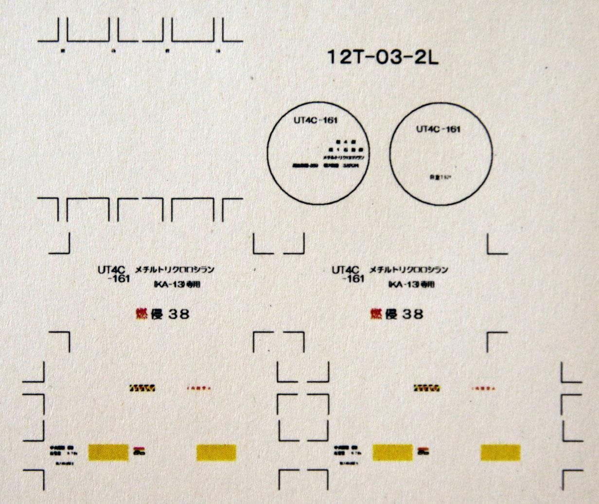 Nゲージサイズの12ftタンクコンテナUT4C「メチルトリクロロシラン」を再現できるデカールです。1個分収録してあります。デカールはクリヤーデカールでお届けします。
