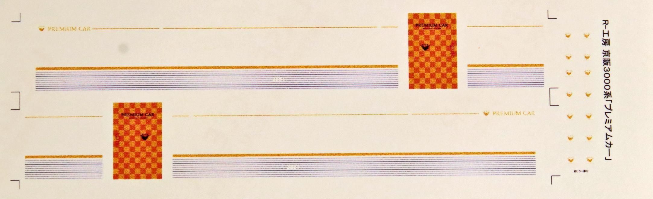 京阪3000系の「プレミアムカー」を再現できる、Nゲージサイズのデカールです。クリヤーデカールに、ライン、文字、ロゴが印刷された物でお届けします。