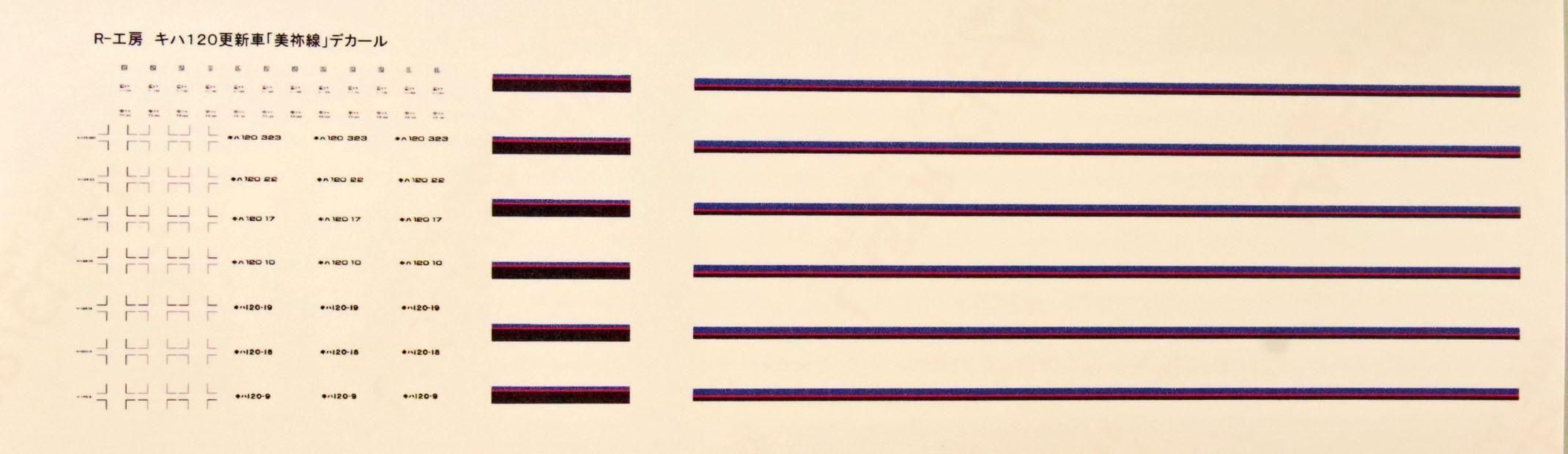キハ120更新車の「美祢線色」を再現できる、Nゲージサイズのデカールです。帯、車番、渡り板番号、所属部分も収録しています。
