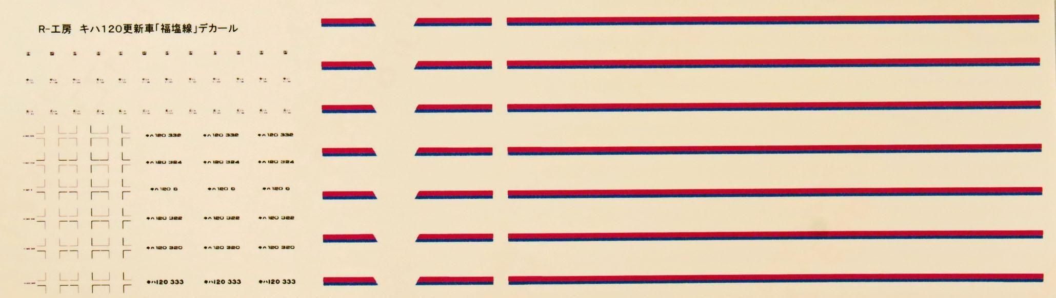キハ120更新車の「福塩線色」を再現できる、Nゲージサイズのデカールです。帯、車番、渡り板番号、所属部分も収録しています。