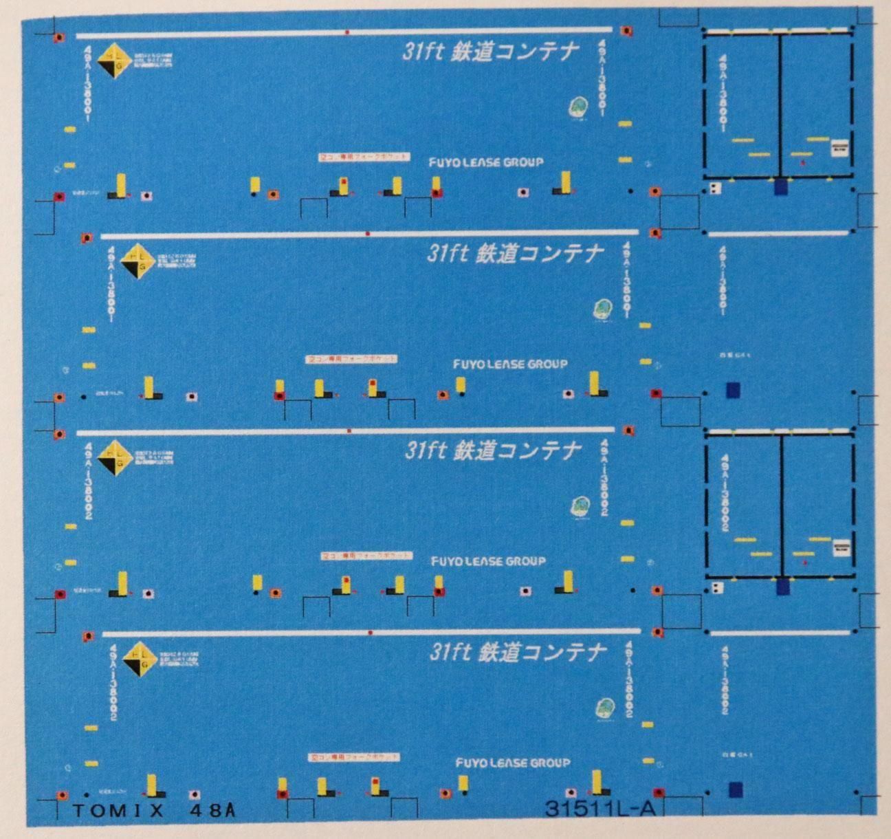 Nゲージサイズの31ftコンテナ「31ft鉄道コンテナ」49Aを再現できるデカールです。大きさはTOMIX48A にあわせています。番号は49A-138001,002になります。写真ではコンテナの地色の水色が印刷してありますが、デカールはクリヤーデカールでお届けします。尚写真のようなコンテナの地色を印刷したものもありますので、そちらを希望の場合はお申し付けください。